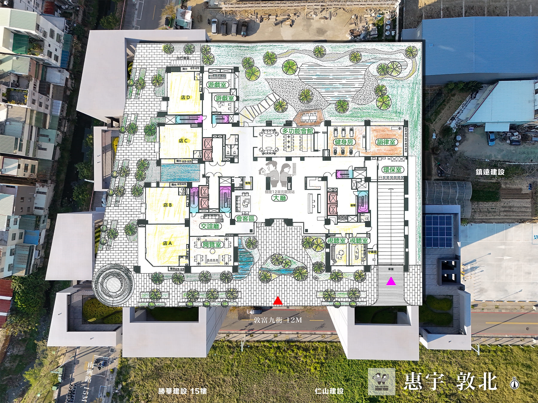 接待大廳、會客室、交誼廳、閱覽室、視聽室、韻律教室、多功能會館、親子遊戲區、曬被區、健身房