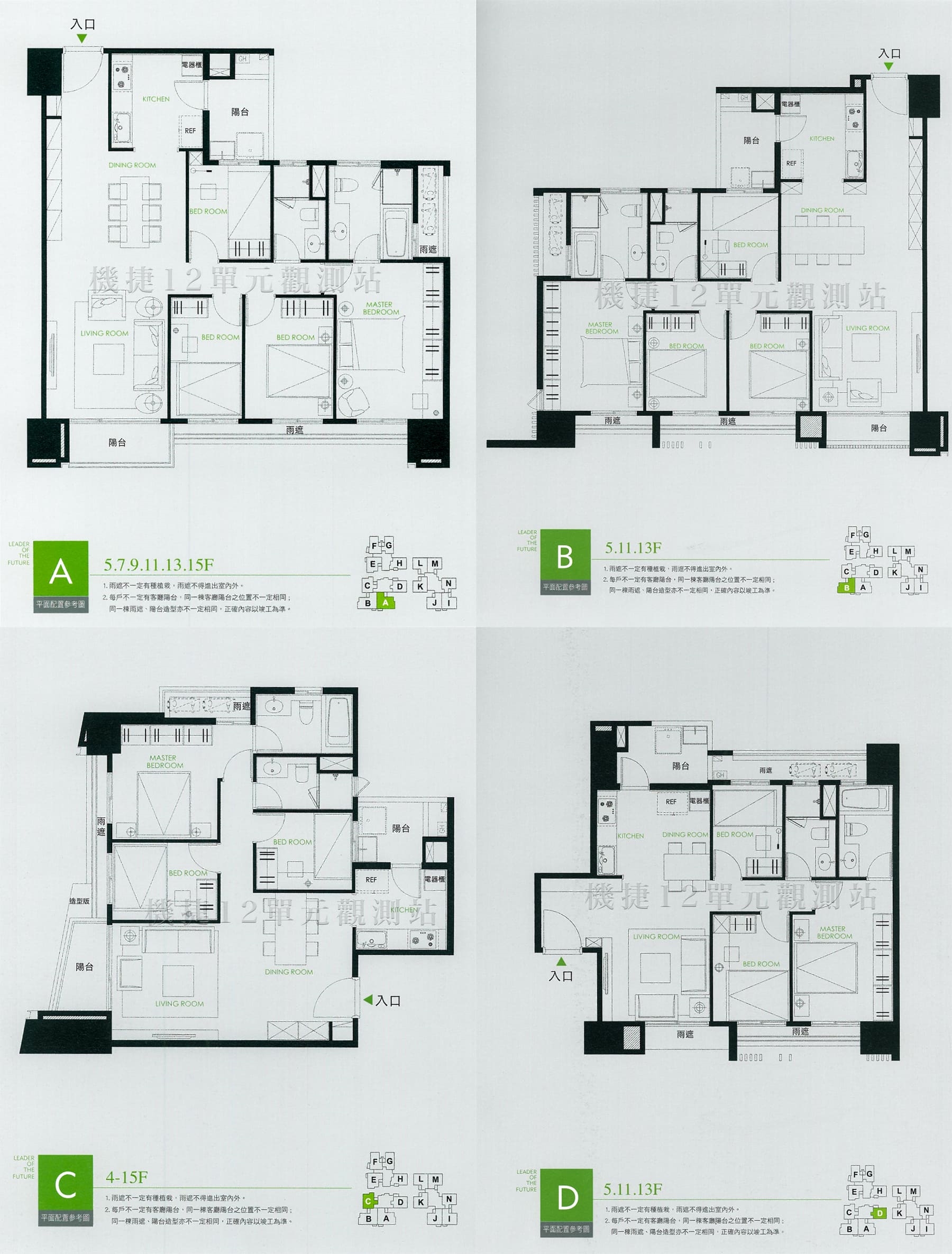 為 4房,格局相近。玄關規劃,廚房與入口玄關有做牆區隔,採雙排獨立式設計,皆有連接工作陽台,通風良好。三面採光,房、廳皆位於採光面上,除玄關處,全戶樑柱皆外推。有獨立的客餐廳空間,方便招待。餐廳空間較寬敞,可擺放較大之餐桌。