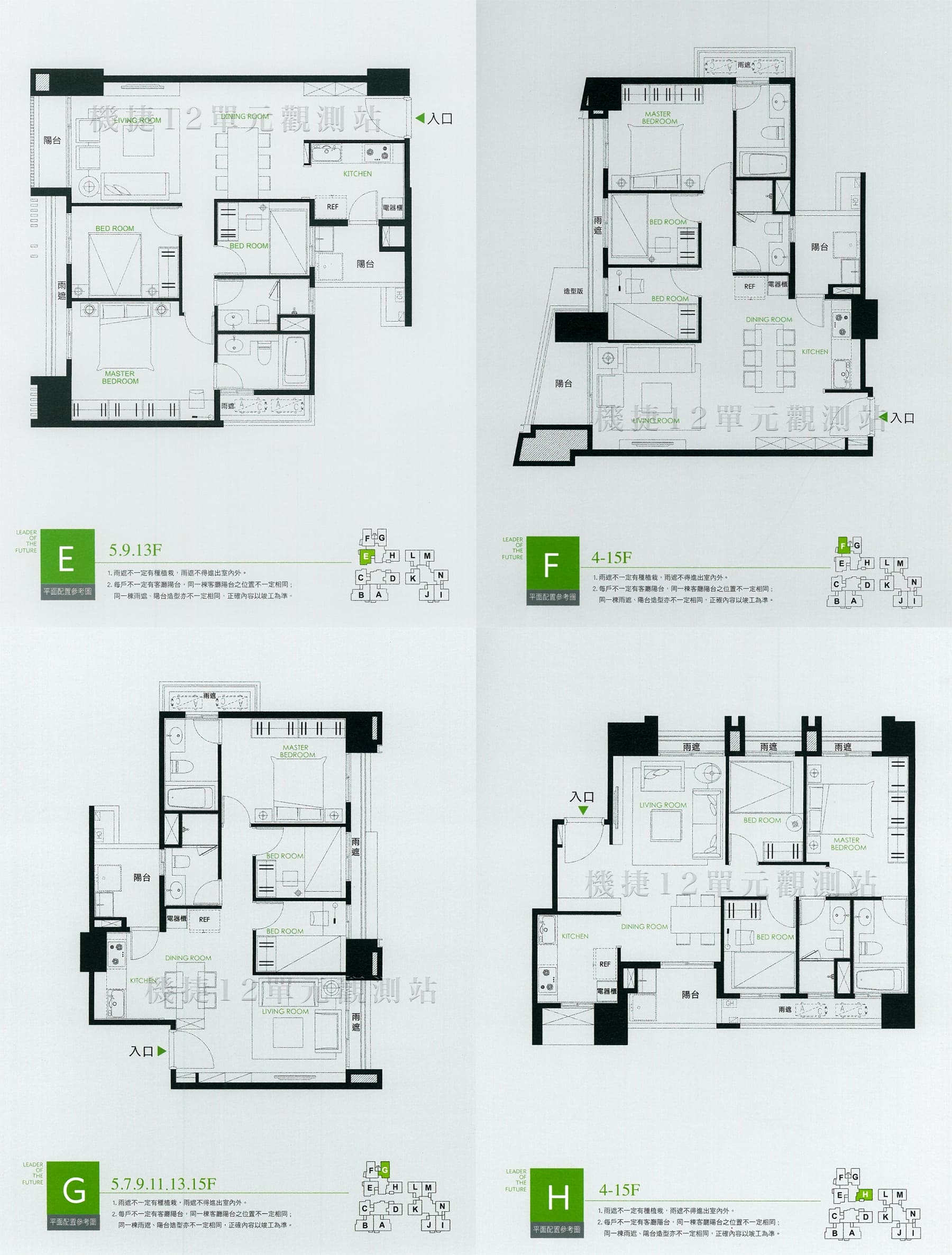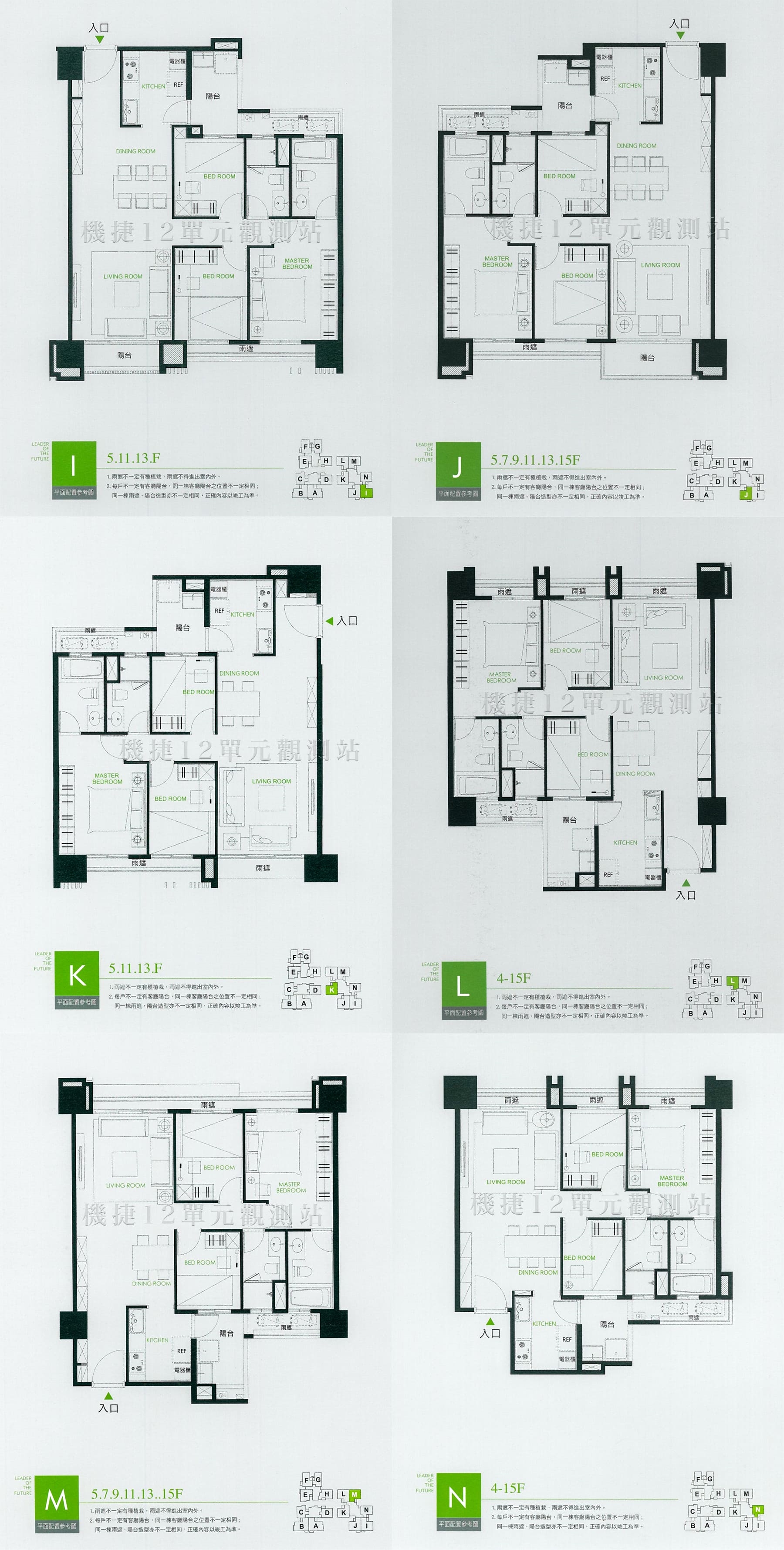 甲棟CD 乙棟EFGH 丙棟IHKLMN戶:皆為 3房,整體格局規劃相似。皆為雙面採光,房、廳皆位於採光面上。