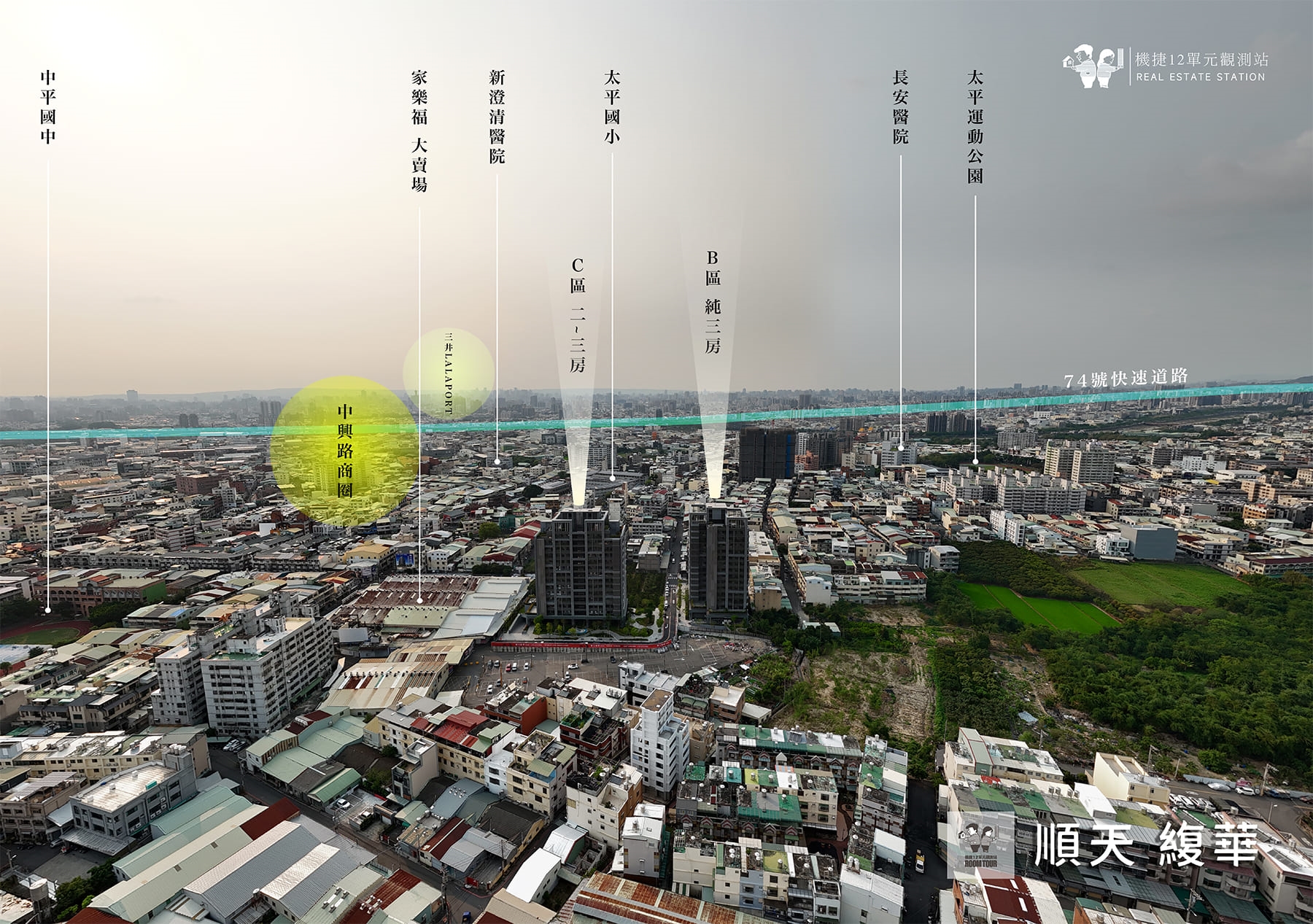 太平公所中興商圈才是南太平最熱鬧的中心地帶,匯集了2所大醫院(長安醫院、新太平澄清醫院),以及11間銀行2所學校,本區是最多傳產工廠企業家聚集的地方,好不容易進駐了能和惠宇、大毅、國泰等級的建商『順天建設』,未來絕對是難太平最有質感的社區,現在能用這個價格入手絕對超值便宜!