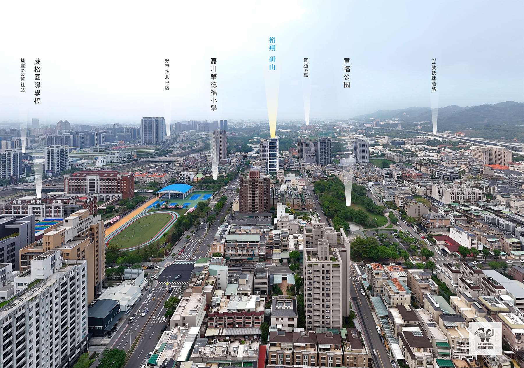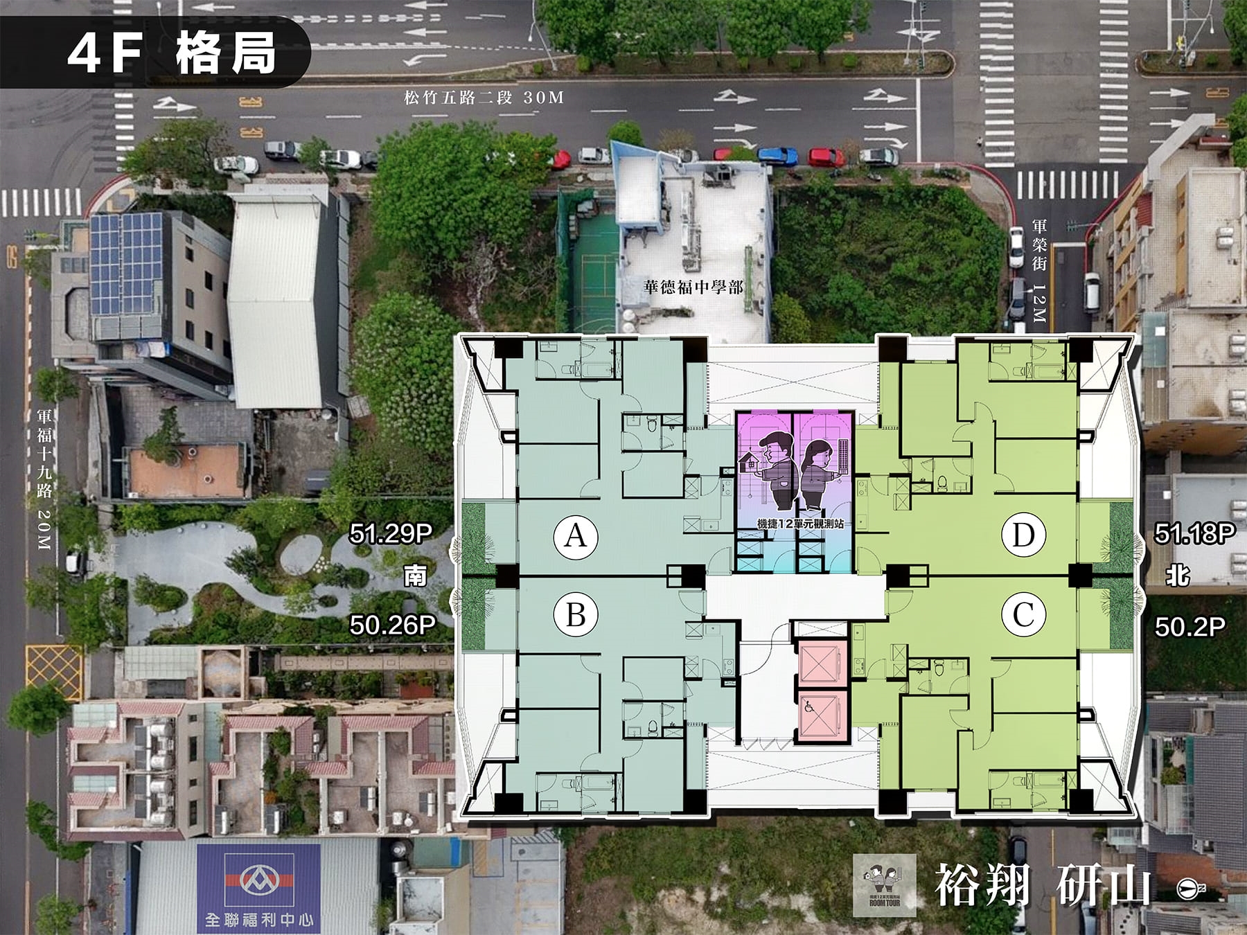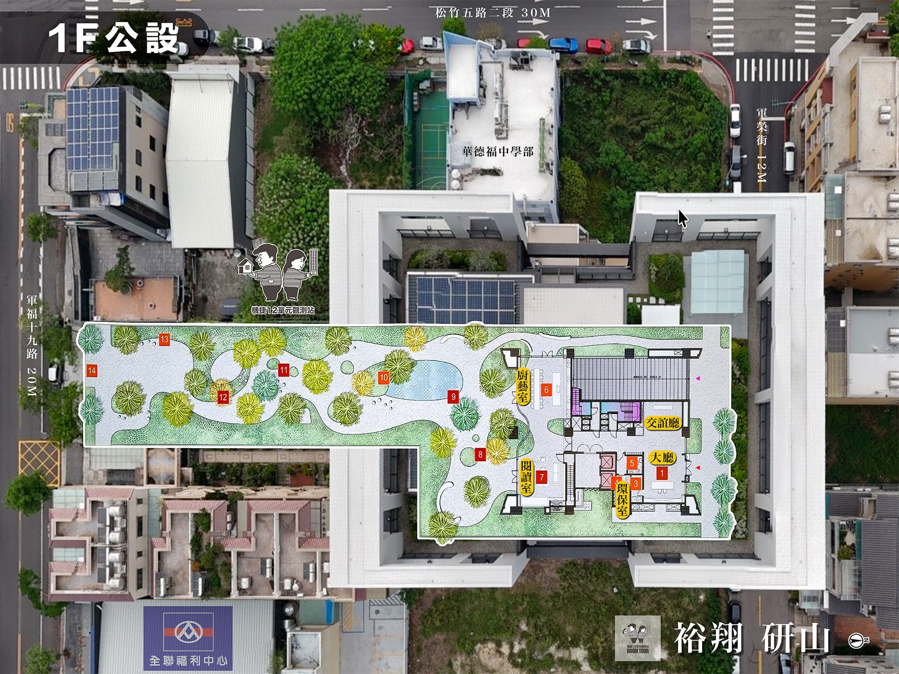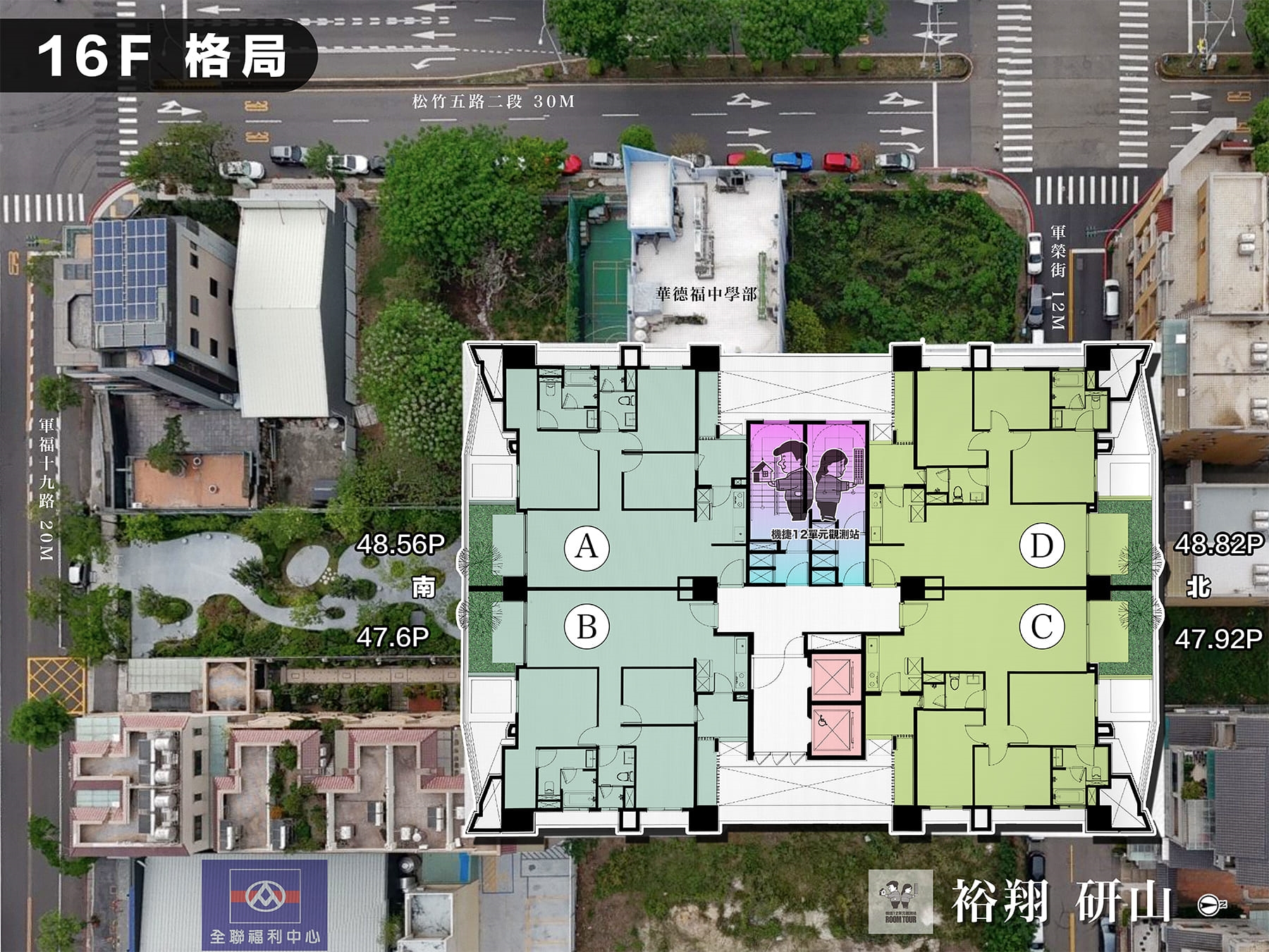 這個基地位在軍福十九路上,前面就能直接看軍福公園&漂亮的葳格中學校園,算是很標準的公園學區宅條件。