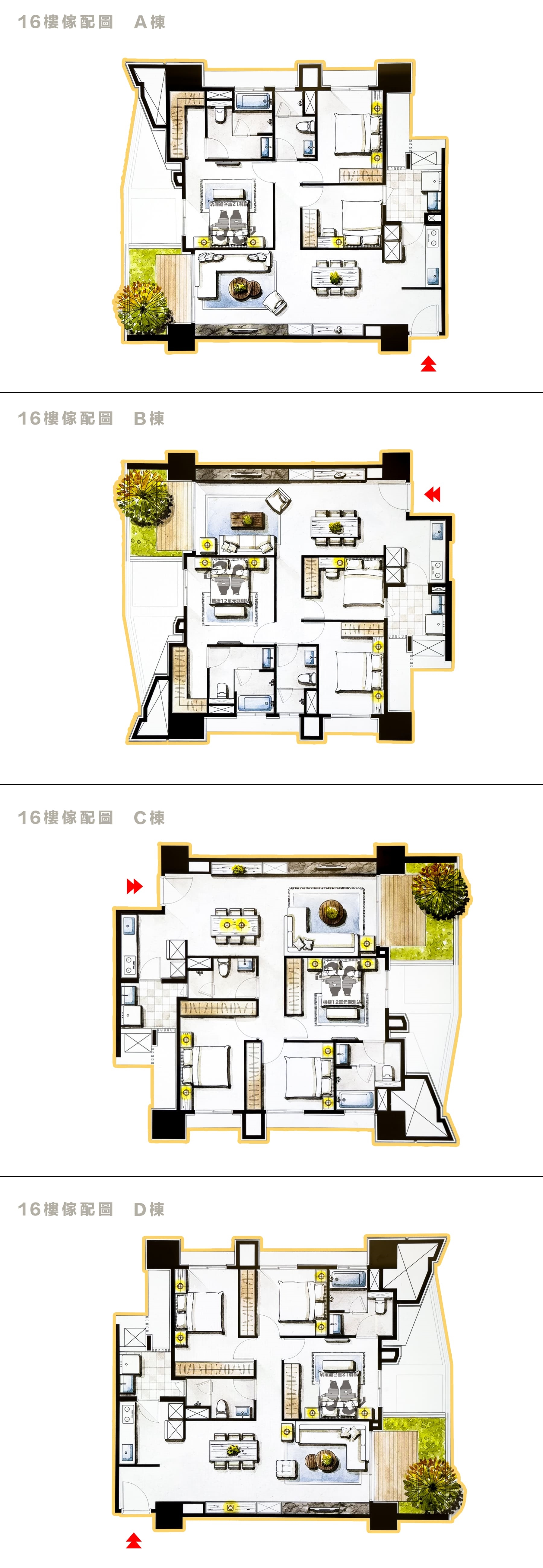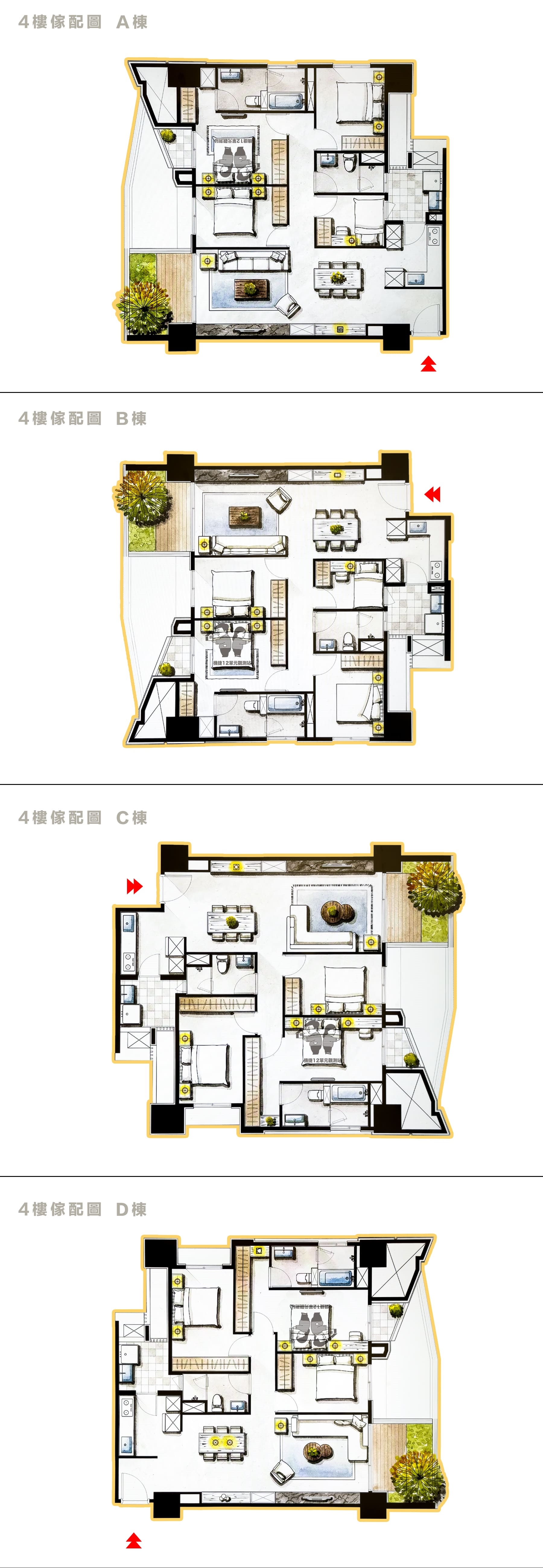 社區本身走的是均質大坪數規劃,以大三房和四房為主。